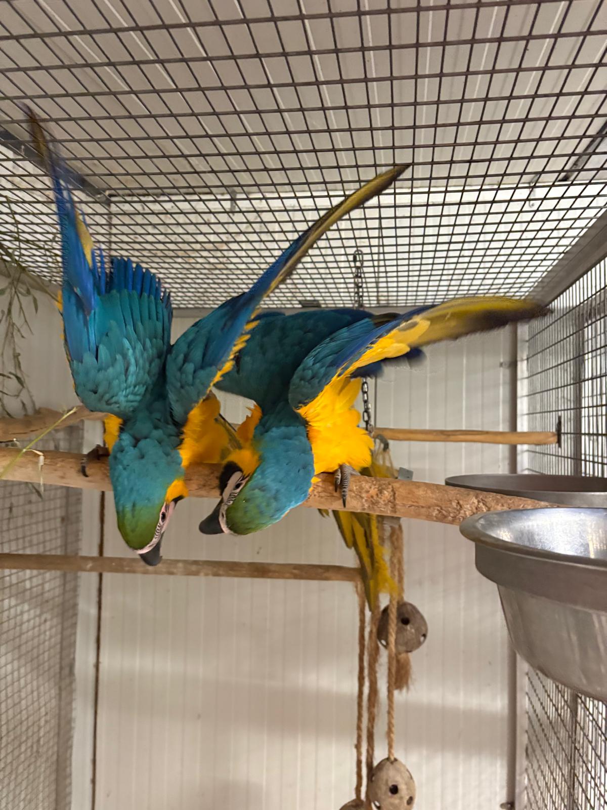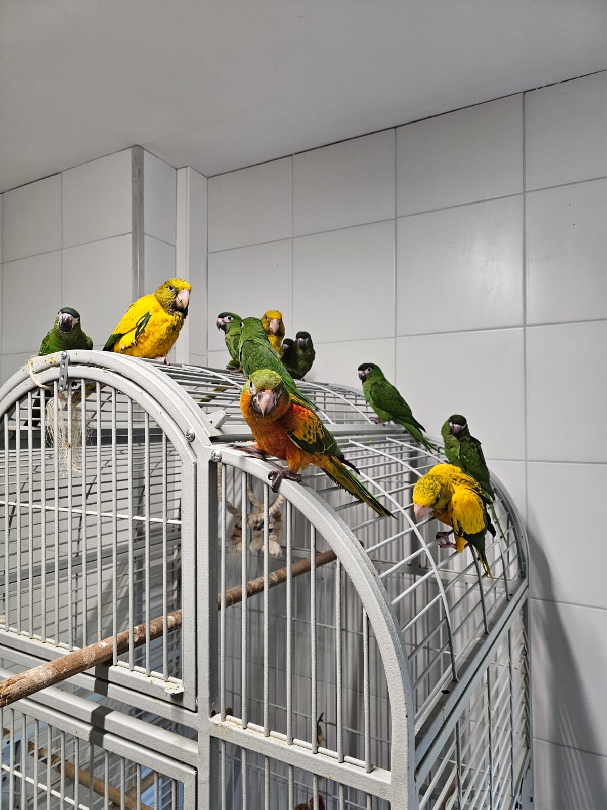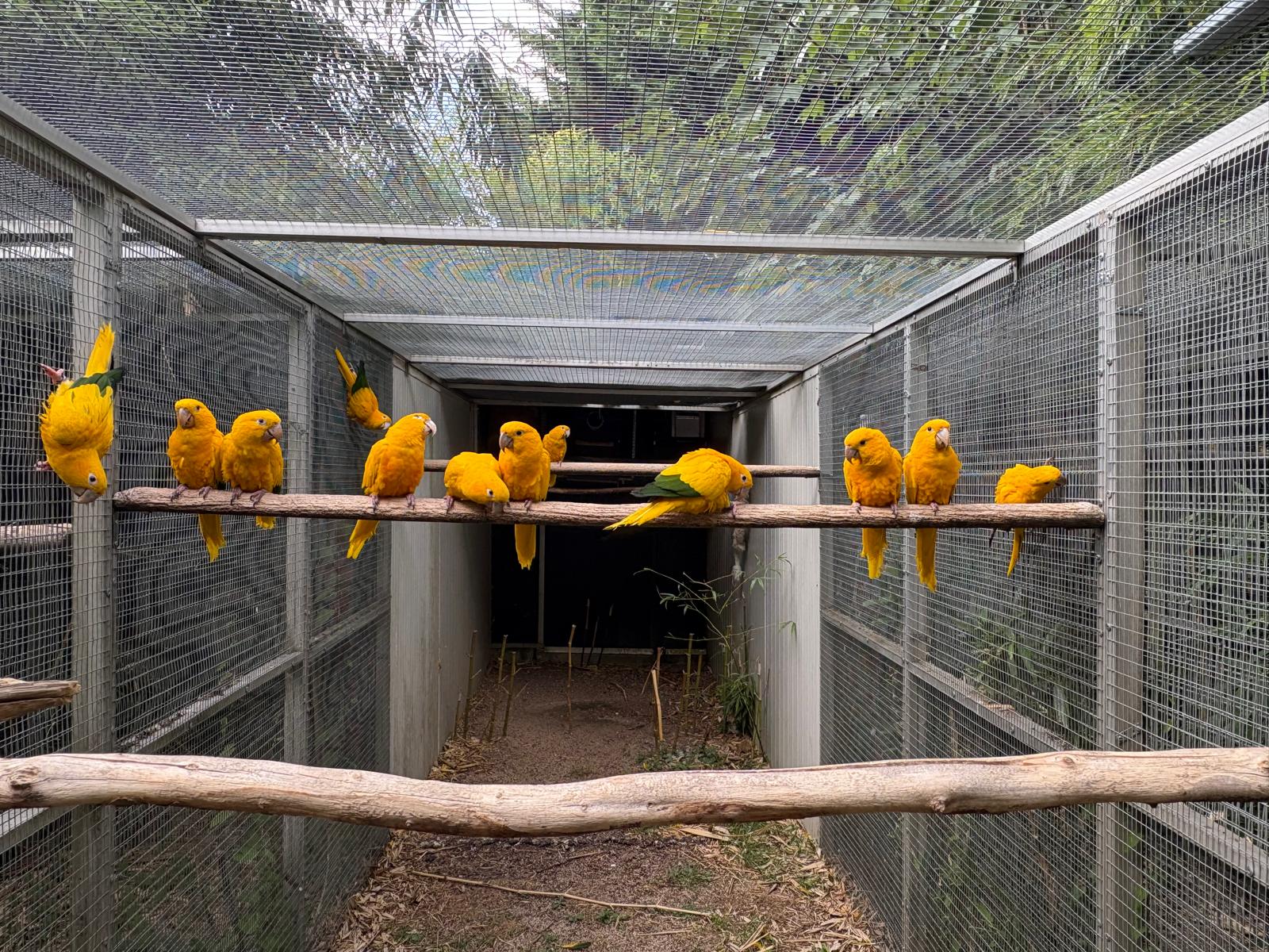 Nos volières intérieures sont spacieuses, lumineuses et chauffées. Chaque espace est aménagé avec des perchoirs en bois naturel, des jouets d’enrichissement et une végétation tropicale pour recréer un environnement stimulant.